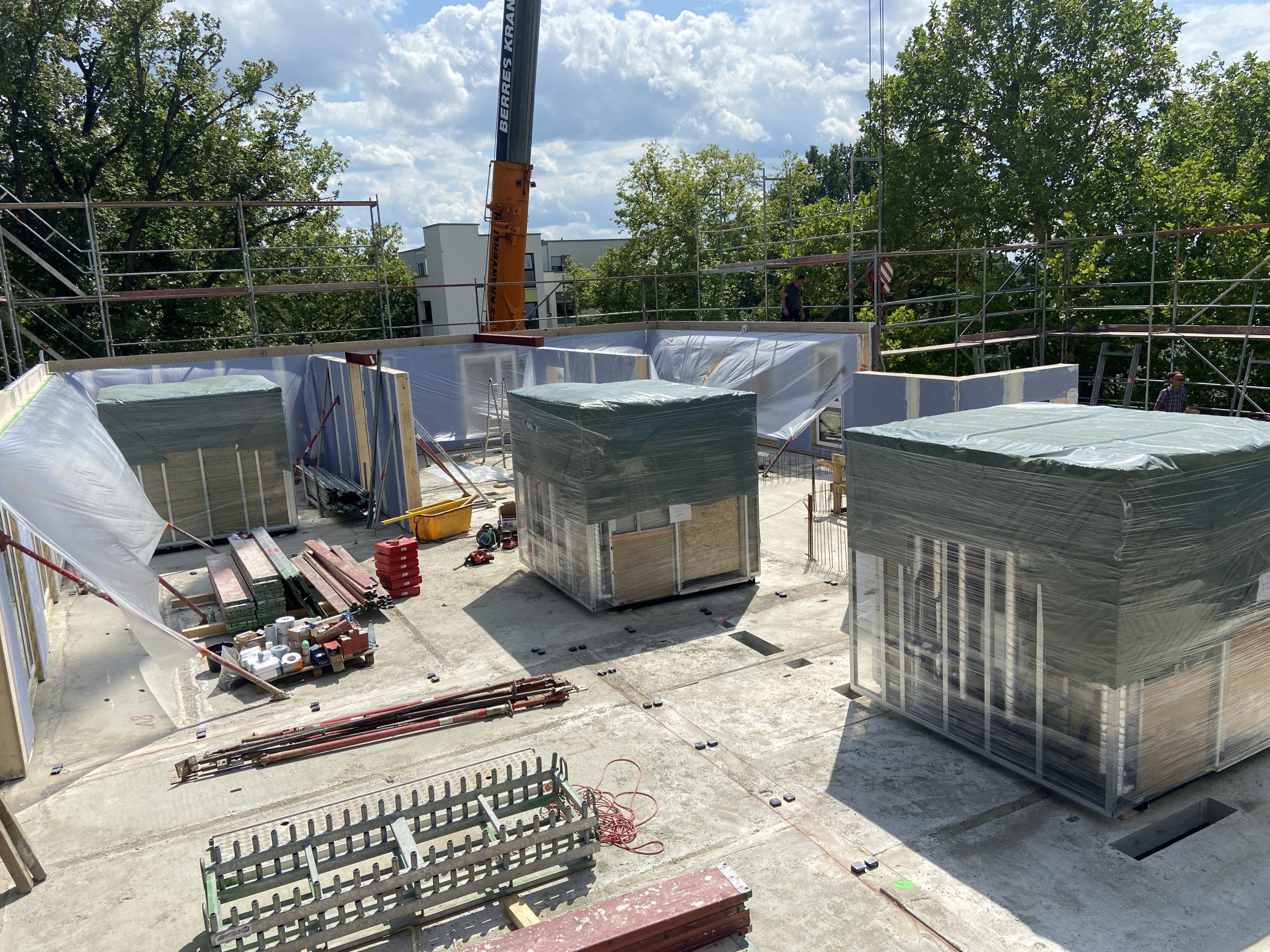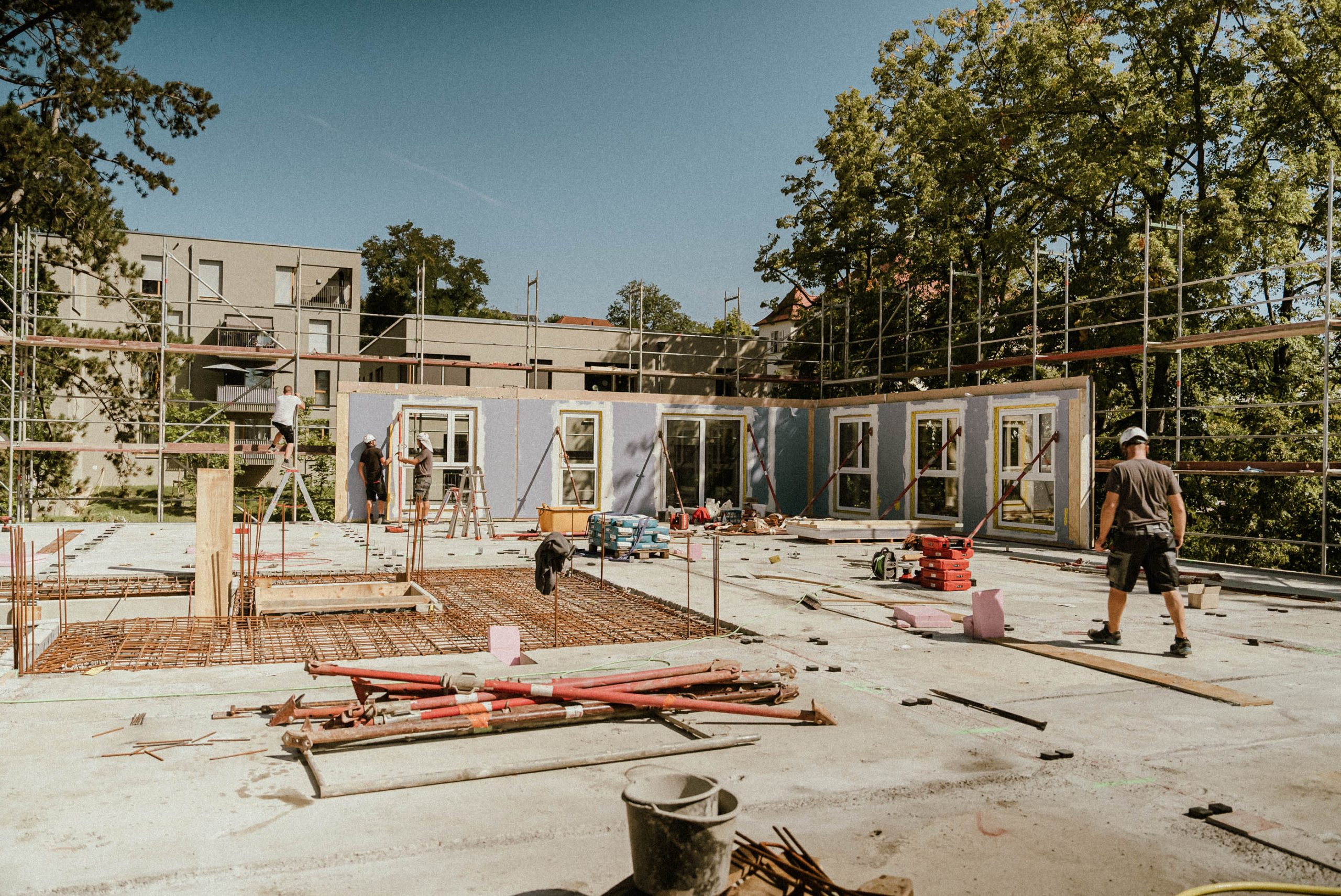 Ein wesentlicher Erfolgsfaktor des Projekts war der hohe Vorfertigungsgrad. Wand- und Dachbauteile wurden industriell vorgefertigt, zusätzlich kamen vorgefertigte Badmodule zum Einsatz. Diese serielle Herangehensweise ermöglichte eine kurze Bauzeit, eine hohe Ausführungsqualität und eine deutliche Reduzierung von Emissionen auf der Baustelle. Der Bauzeitraum erstreckte sich von April 2024 bis April 2025.