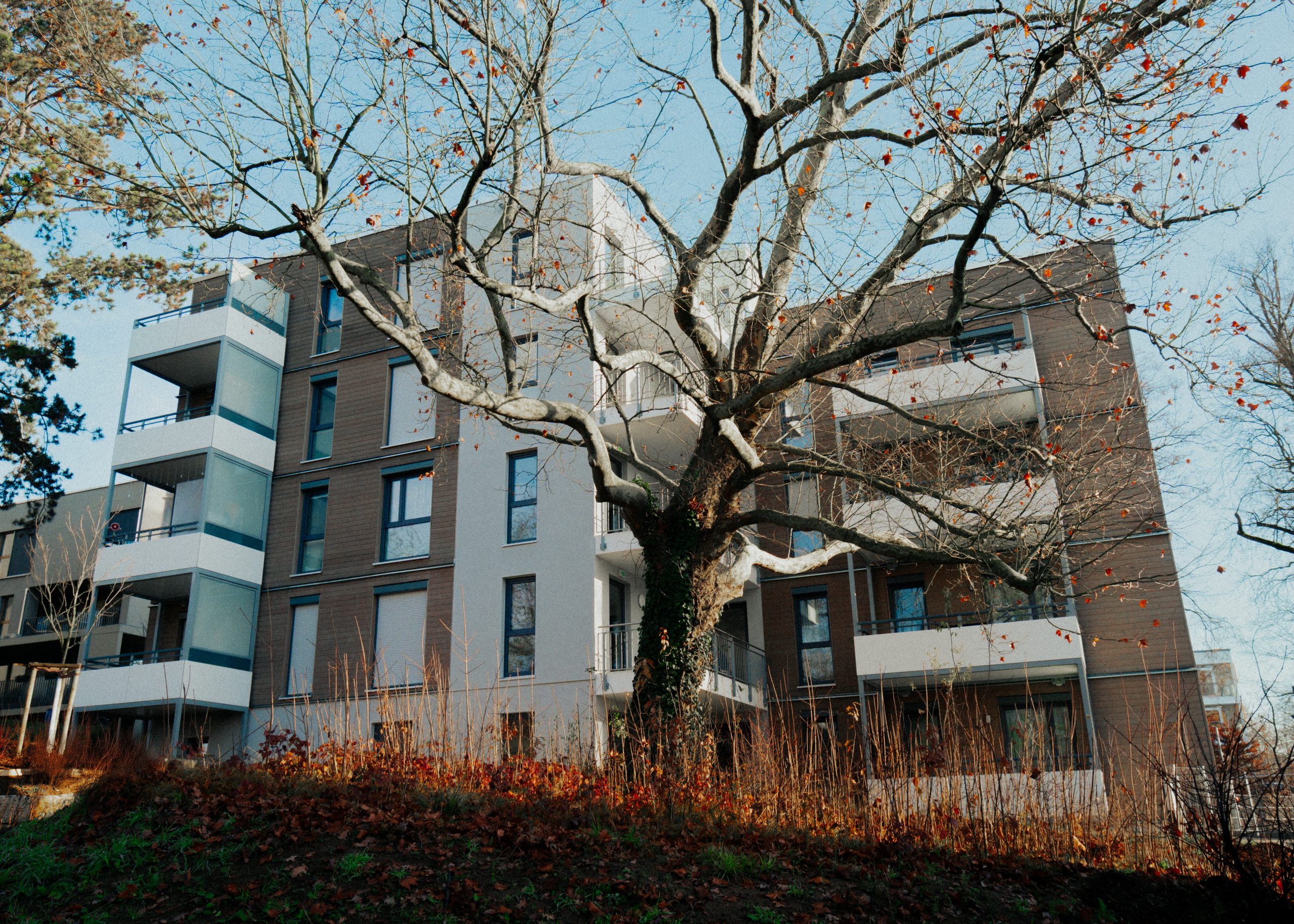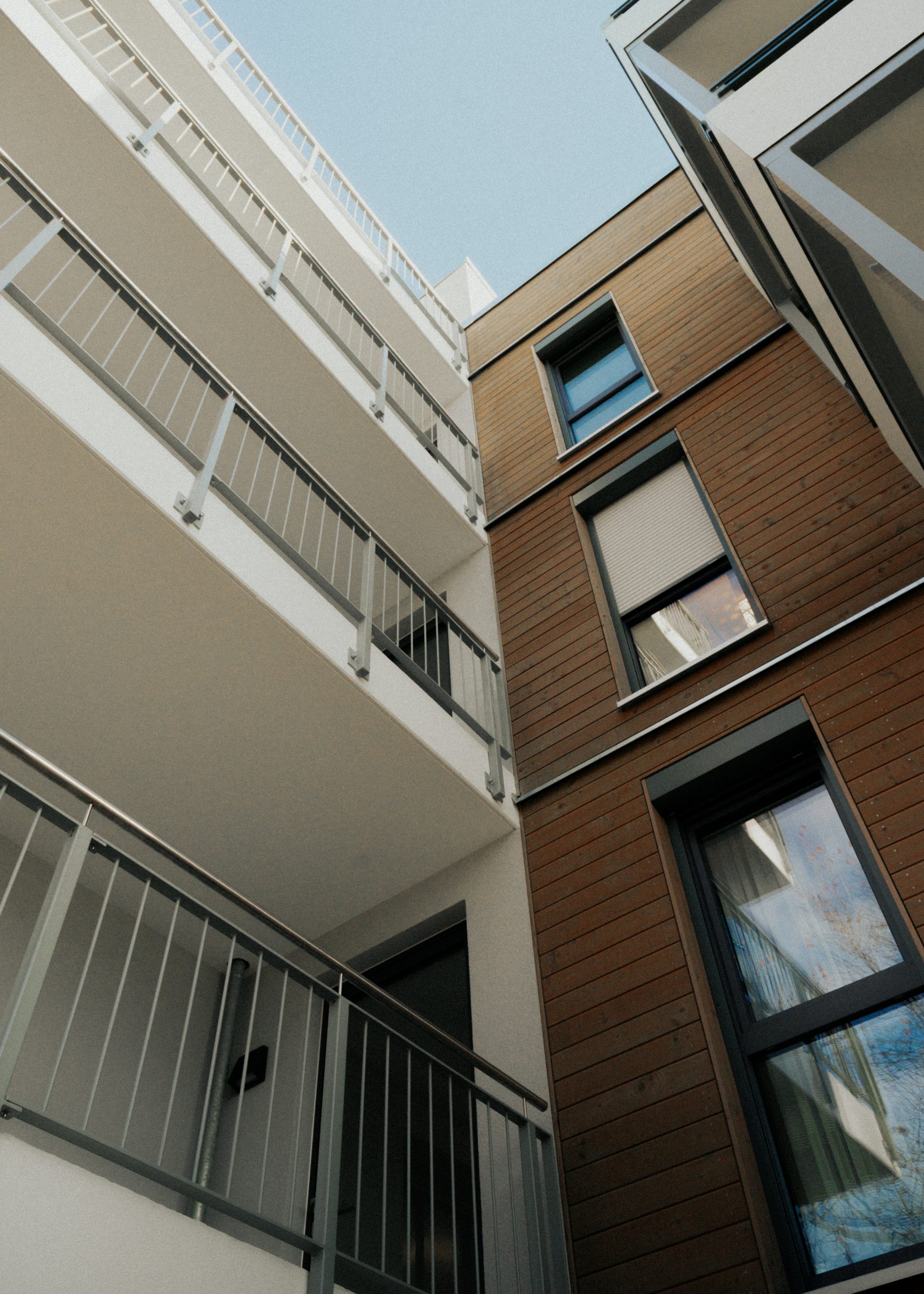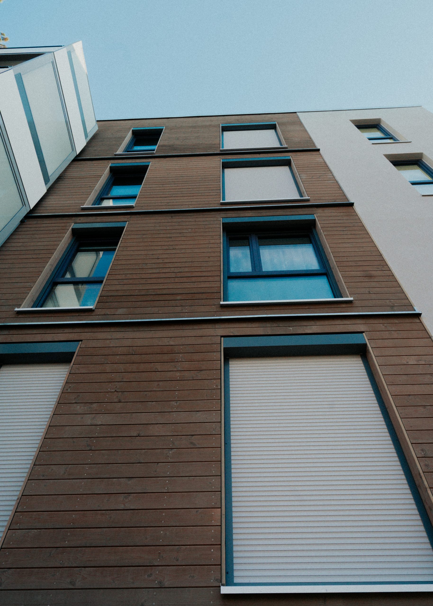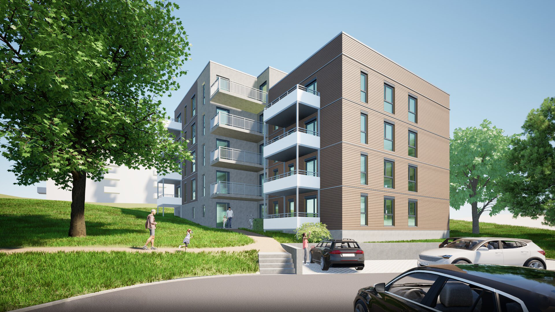 Der Neubau wurde in Holzhybridbauweise mit Teilunterkellerung umgesetzt und erfüllt die Anforderungen des GEG 40. Holz bildet das konstruktive Rückgrat des Gebäudes und wurde gezielt mit ergänzenden Baustoffen kombiniert, um den Anforderungen an Statik, Brand- und Schallschutz im mehrgeschossigen Wohnungsbau gerecht zu werden. Architektonisch prägend sind das Flachdach sowie ein Gebäudesprung mit Höhenversatz um ein Geschoss, der dem Baukörper eine klare Gliederung und zeitgemäße Erscheinung verleiht. Das Gebäude erstreckt sich vom Kellergeschoss bis zum vierten Obergeschoss.
