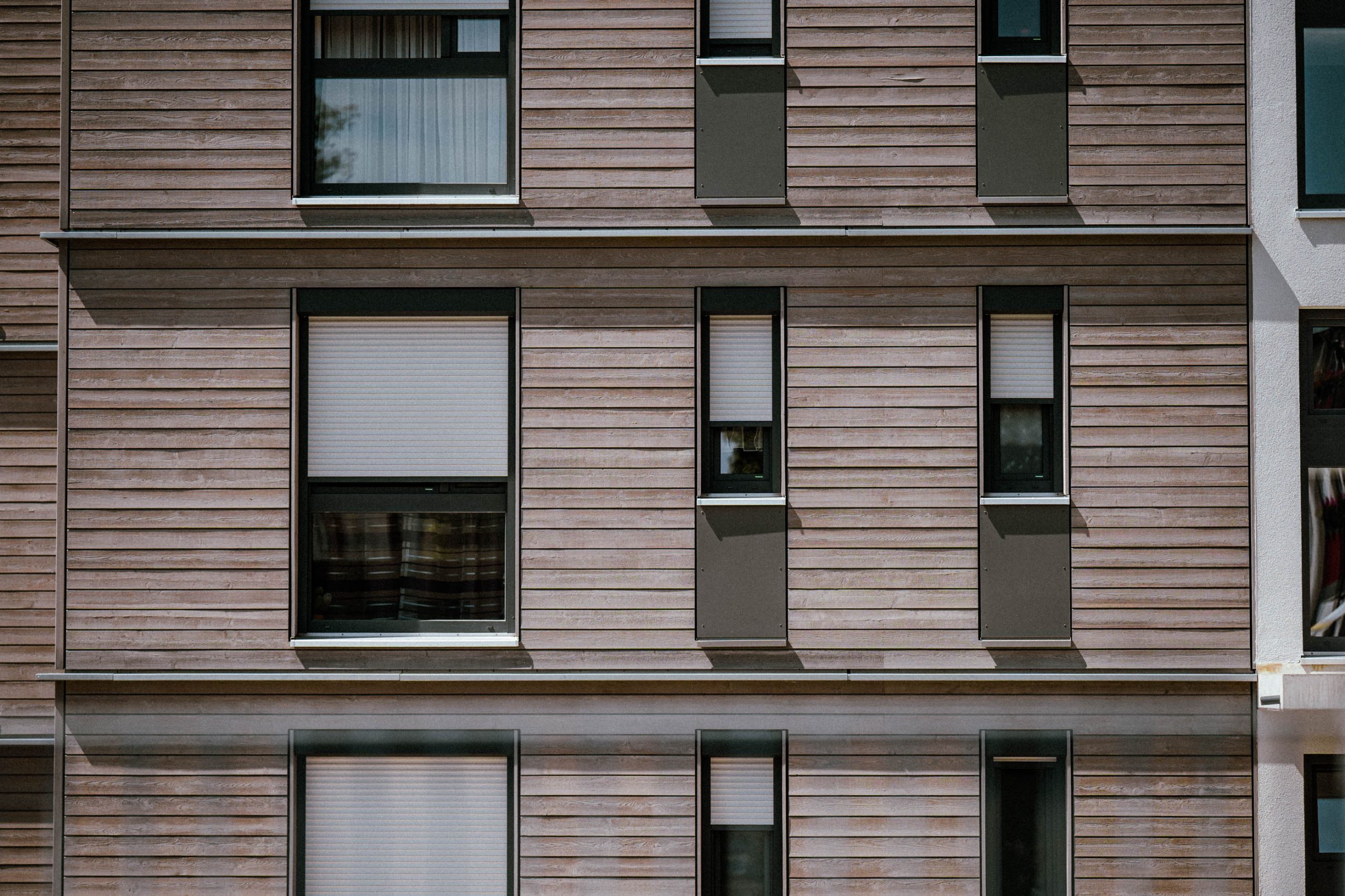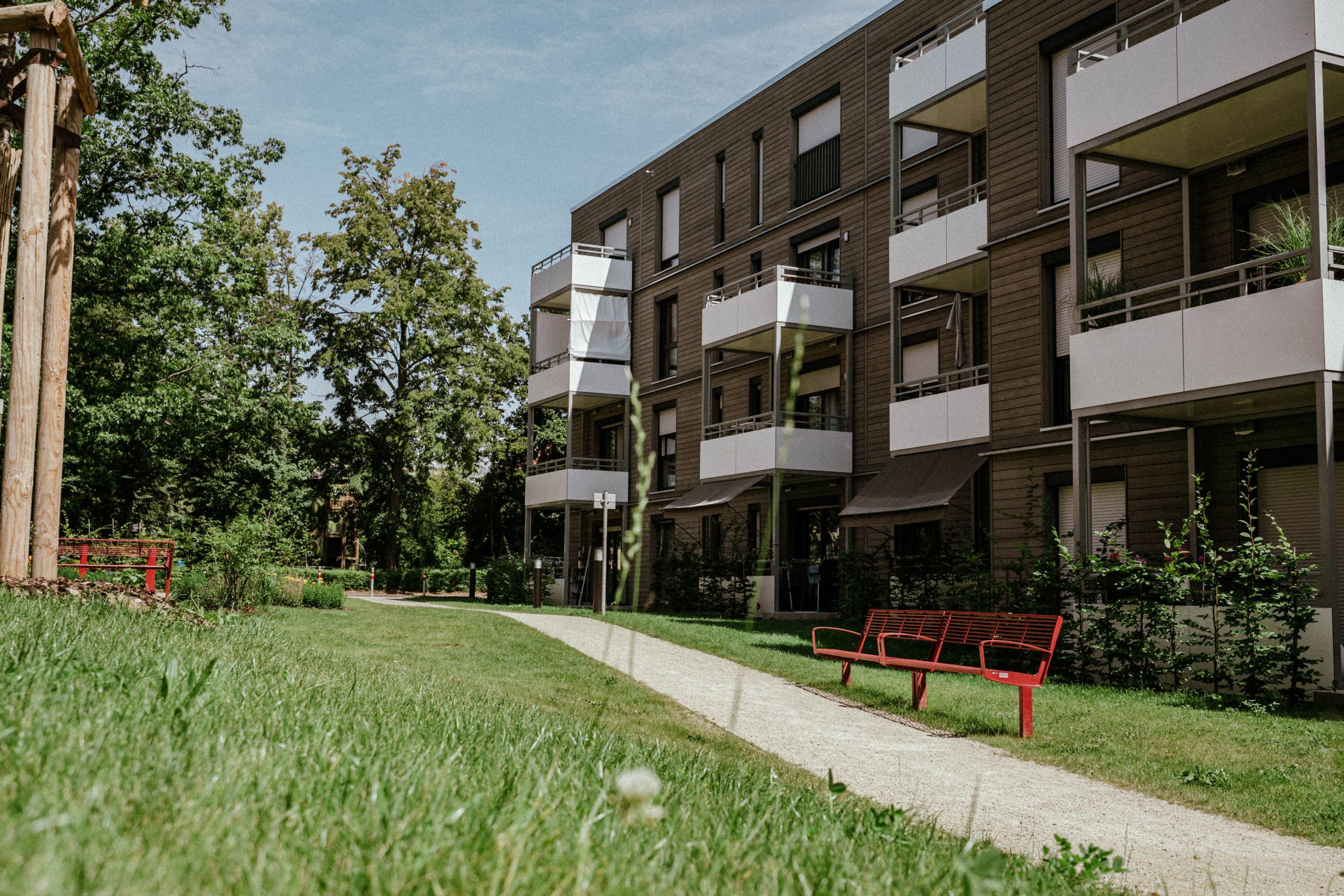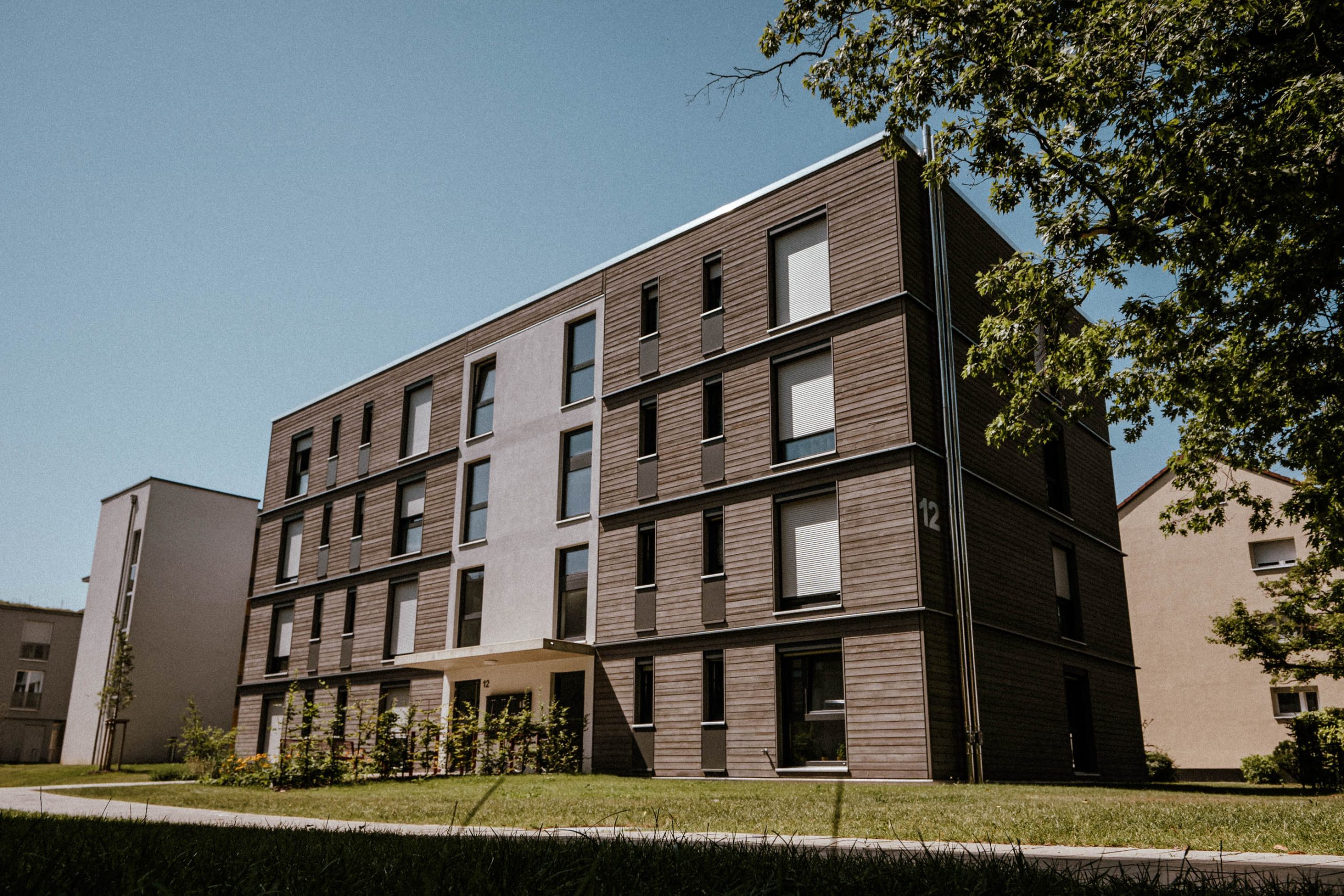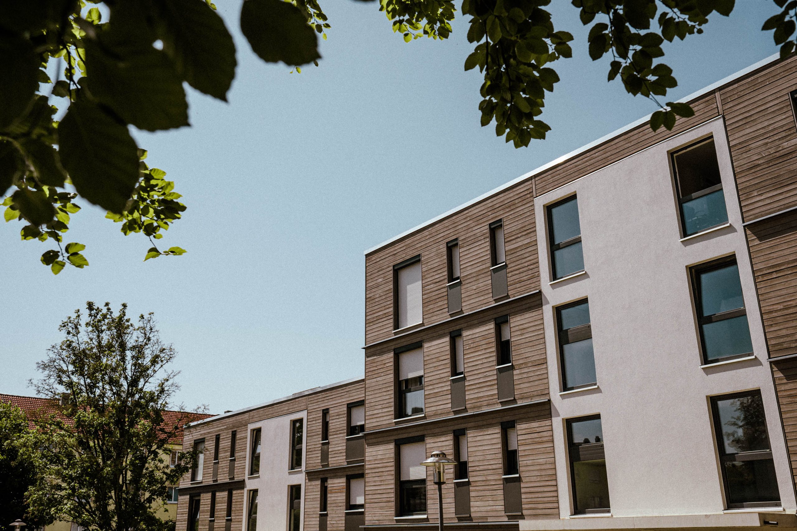 Realisiert wurde der Neubau in Holzhybridbauweise und im KfW-40-Standard. Die drei Gebäude mit Flachdach erstrecken sich jeweils vom Kellergeschoss bis zum dritten Obergeschoss. Holz bildet das konstruktive Rückgrat und wird mit ergänzenden Baustoffen kombiniert, um die Anforderungen an Statik, Brand- und Schallschutz im mehrgeschossigen Wohnungsbau sicher zu erfüllen. Die klare architektonische Gestaltung verleiht dem Ensemble eine zeitgemäße Erscheinung und fügt sich selbstverständlich in das Umfeld ein.