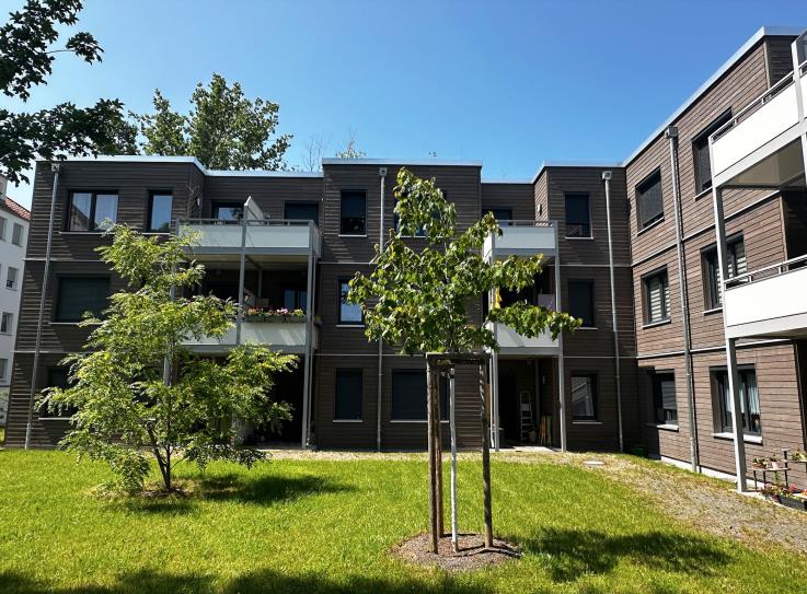 Neubau von zweibarrierefreie Wohngebäuden (teilweise rollstuhlgerecht) in Holzmassiv-Hybrid-Systembauweise mit vorgefertigten Vollmontagedecken, Holzwandelementen, Fertigbädern, Tiefgarage im Hinterhaus.